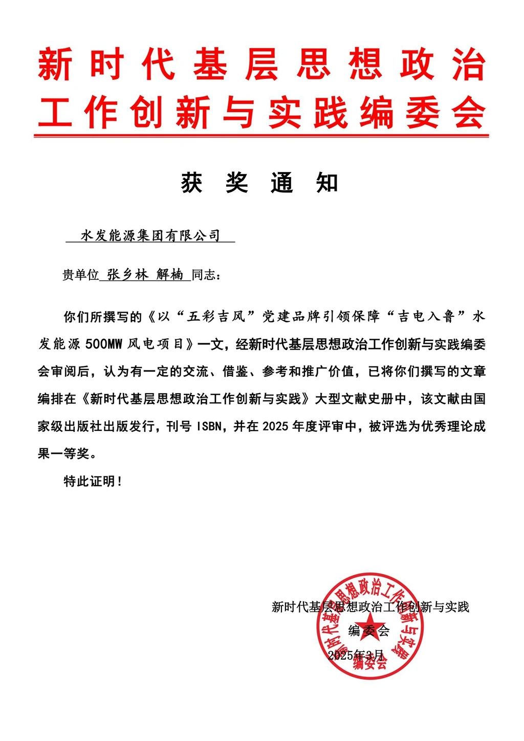 水發(fā)能源通榆公司“五彩吉風(fēng)”黨建論文榮獲優(yōu)秀理論成果一等獎(jiǎng)